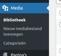 Helaas kent Wordpress alleen categorieën voor zogenaamde "posts". Om de foto's op de website te markeren voor het fotoboek is de wordpress plugin Media Library Categories nodig (of een andere plugin waarmee media items van een categorie kunnen worden voorzien. Na installatie en activering verschijnt een sectie categorieën in het hoofdmenu onder media. Kies dit menu item.