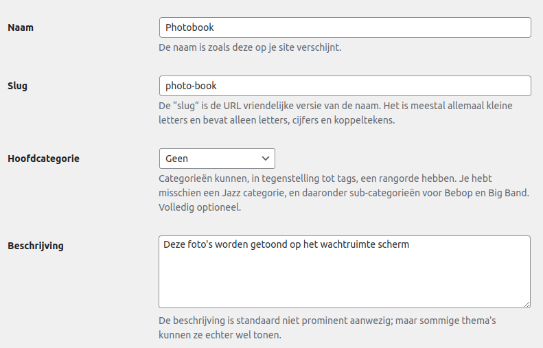 In deze sectie staat initieel alleen de categorie "Niet gecategoriseerd". Voeg hier de categorie "Photobook" aan toe: