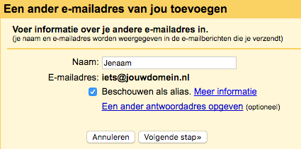 Je voert je naam in waarmee de e-mails verstuurt dienen te worden en klikt op "Volgende stap".