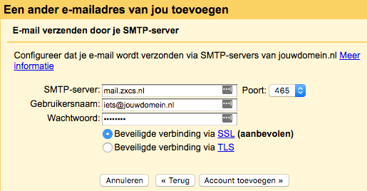 Geef bij "SMTP-server" de gegevens in zoals weergegeven staan in de afbeelding hieronder. Selecteer poort 465 en geef weer de inloggegevens van je e-mail account in. Daarnaast selecteer je "Beveiligde verbinding via SSL".
